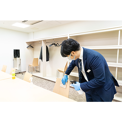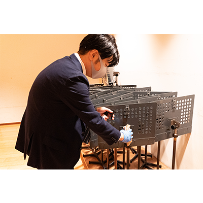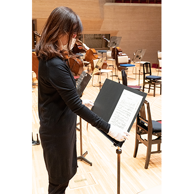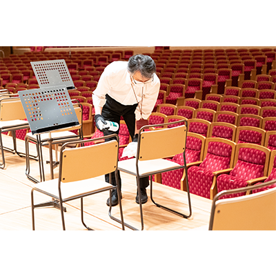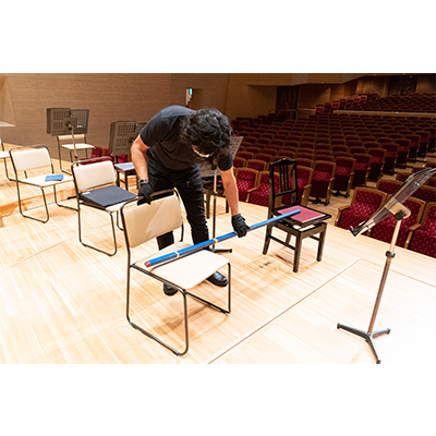 リハーサル、本番時のマスクの着用については任意としていますが、ステージが進んでも、楽員・スタッフの検温や手洗い、楽屋の使用人数制限、使用場所・機材の消毒等、感染防止対策は引き続き徹底して行ってまいります(写真参照)。